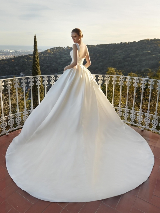 Este vestido em piquê com silhueta evasê e decote quadrado é ideal para uma noiva que procura elegância com um toque moderno.