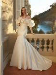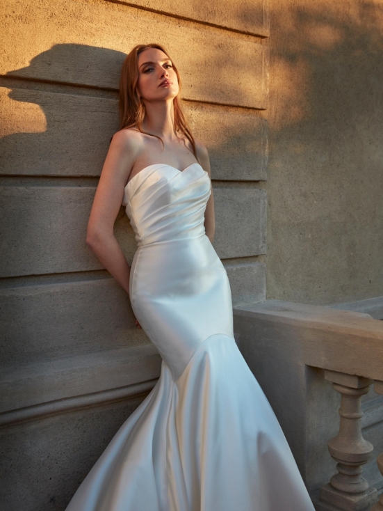 Design em mikado com silhueta sereia e decote sem alças. Uma proposta minimalista e elegante para uma noiva confiante